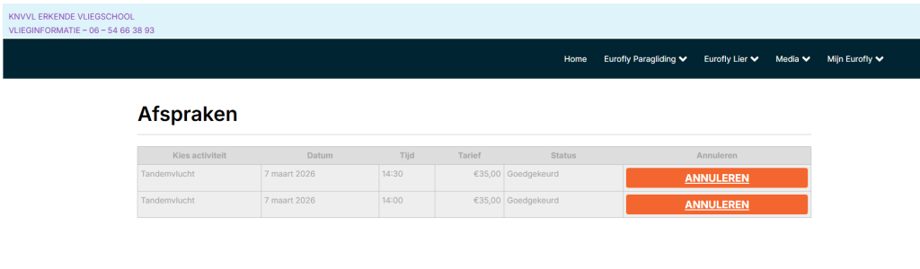 Belangrijk: Dit is een geautomatiseerde email en is niet een bevestiging dat er werkelijk gevlogen kan worden. Belt u op de dag/weekend welke u heeft gereserveerd altijd na 08:00 uur naar 06 – 54 66 38 93. U hoort dan op de voicemail of er die dag gevlogen wordt. Of kijk op de website naar de vliegverwachtings pagina.